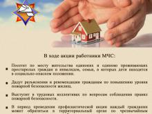В ходе акции акцент будет сделан на обследование противопожарного состояния домовладений одиноких и одиноко проживающих пожилых граждан, инвалидов, семей, в которых дети находятся в социально опасном положении, проведение с ними инструктивно-разъяснительной работы по соблюдению правил пожарной безопасности, а также информирование населения о возможностях государственных организаций по оказанию услуг по обеспечению их безопасности.
